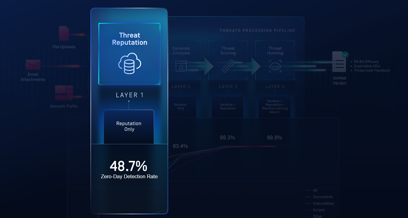 Real-time and offline reputation checks for files, URLs, IPs, and domains filter out known threats instantly using global intelligence from billions of indicators.