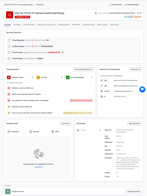 In this observed case, a PNG image contains an embedded command within its metadata that fetches and executes a remote PHP web shell hosted on GitHub. The payload is retrieved and executed on the host — effectively turning an innocent-looking image into a web-based loader. The use of trusted infrastructure and obfuscated code hidden in metadata enables attackers to bypass traditional static detection.