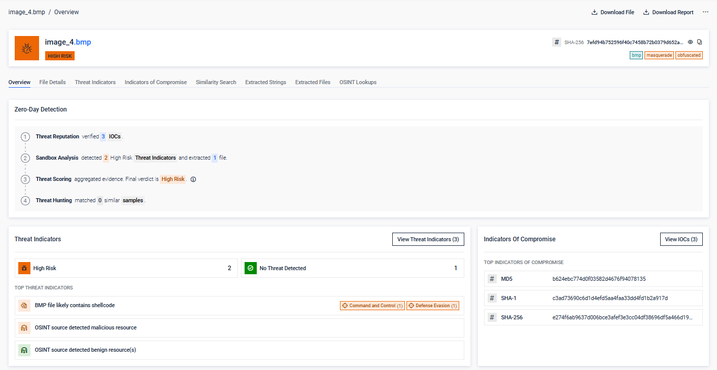 MetaDefender Sandbox detects this early-stage masquerading, extracts the shellcode within the spoofed BMP container— enabling analysts to proceed with in-depth shellcode analysis.