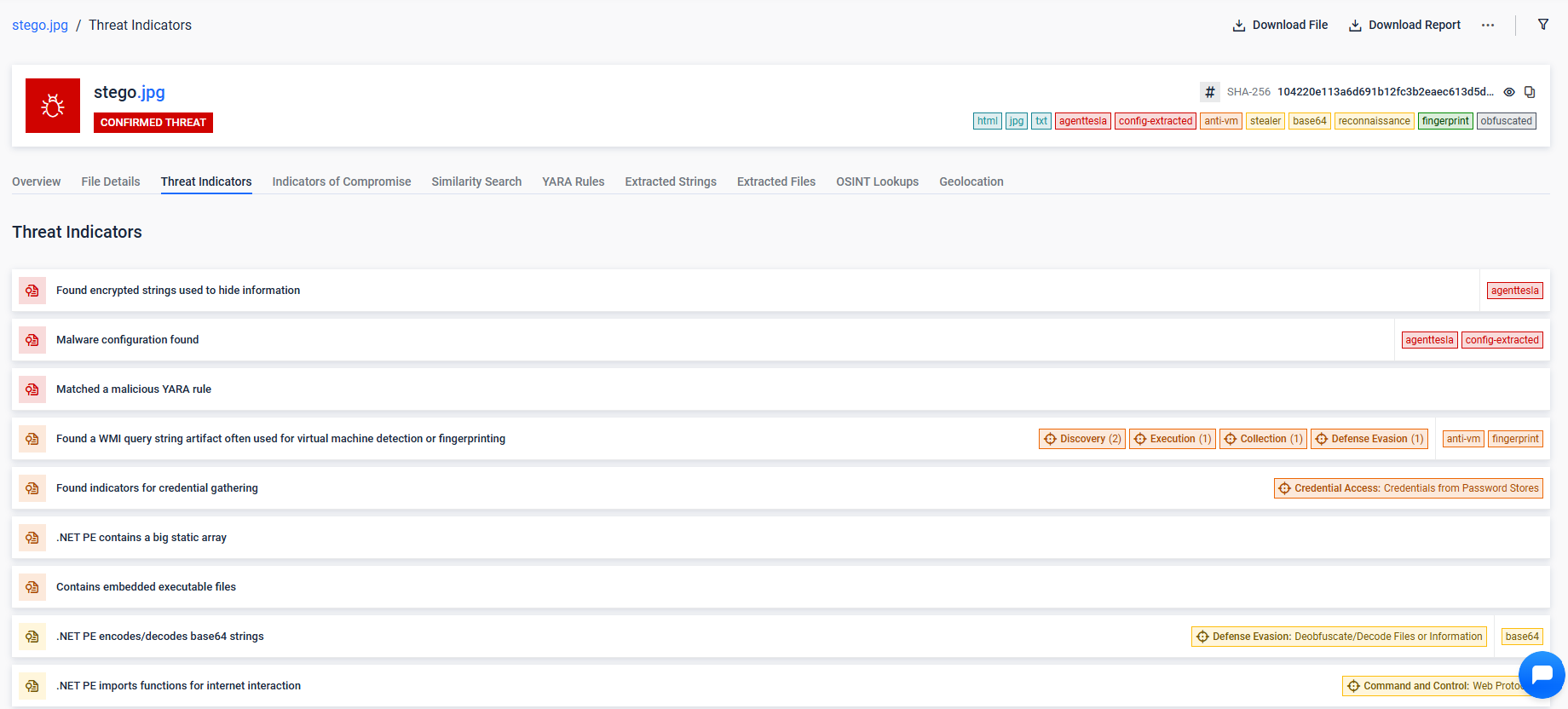 In recent campaigns, stegomalware has leveraged images to distribute infostealers. The sample under analysis is a JPG file containing a reversed Base64-encoded PE. MetaDefender Sandbox detected the anomaly, extracted and decoded the payload, and identified it as AgentTesla, a well-known .NET-based infostealer. Further analysis uncovered encrypted strings and C2 configuration data, enabling attribution and mapping of the malware’s command-and-control infrastructure.