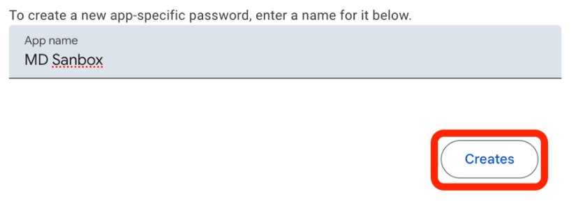 • In new page opened, write a name for your App password and click “Creates”