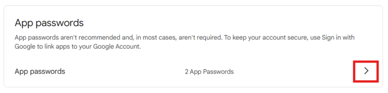 • Scroll down to section “App passwords” and click arrow in front of “App passwords”