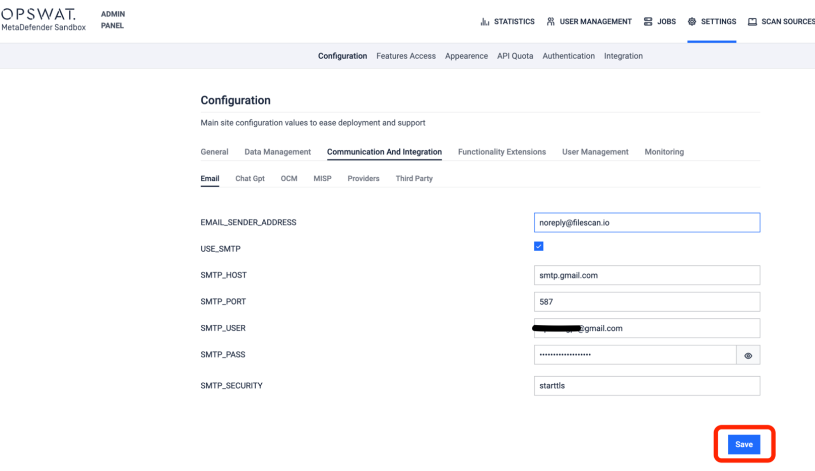 To be able to send notification to your Gmail mailbox from MetaDefender Sandbox the following fields should be configured properly under MetaDefender Sandbox: