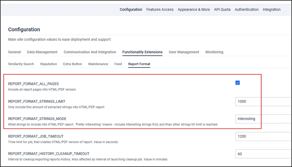 Reduce the limit of extracted strings included in the generated PDF by editing the REPORT_FORMAT_STRINGS_LIMIT - Only include this amount of extracted strings into HTML/PDF report