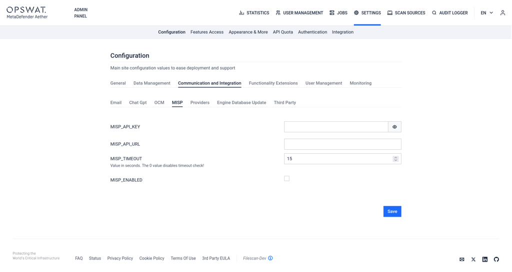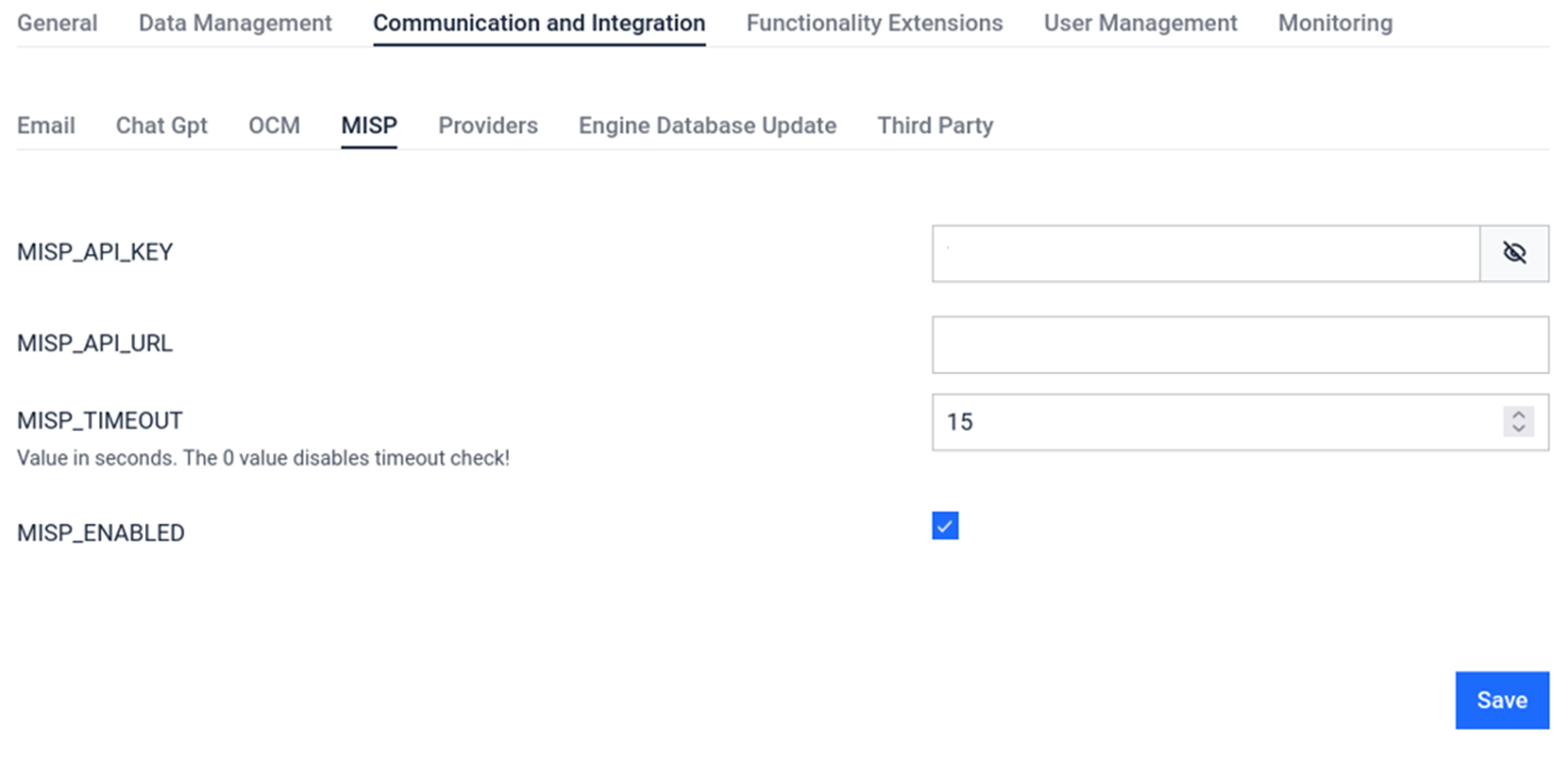 MISP_ENABLED | Check-box to enable or disable MISP integration |