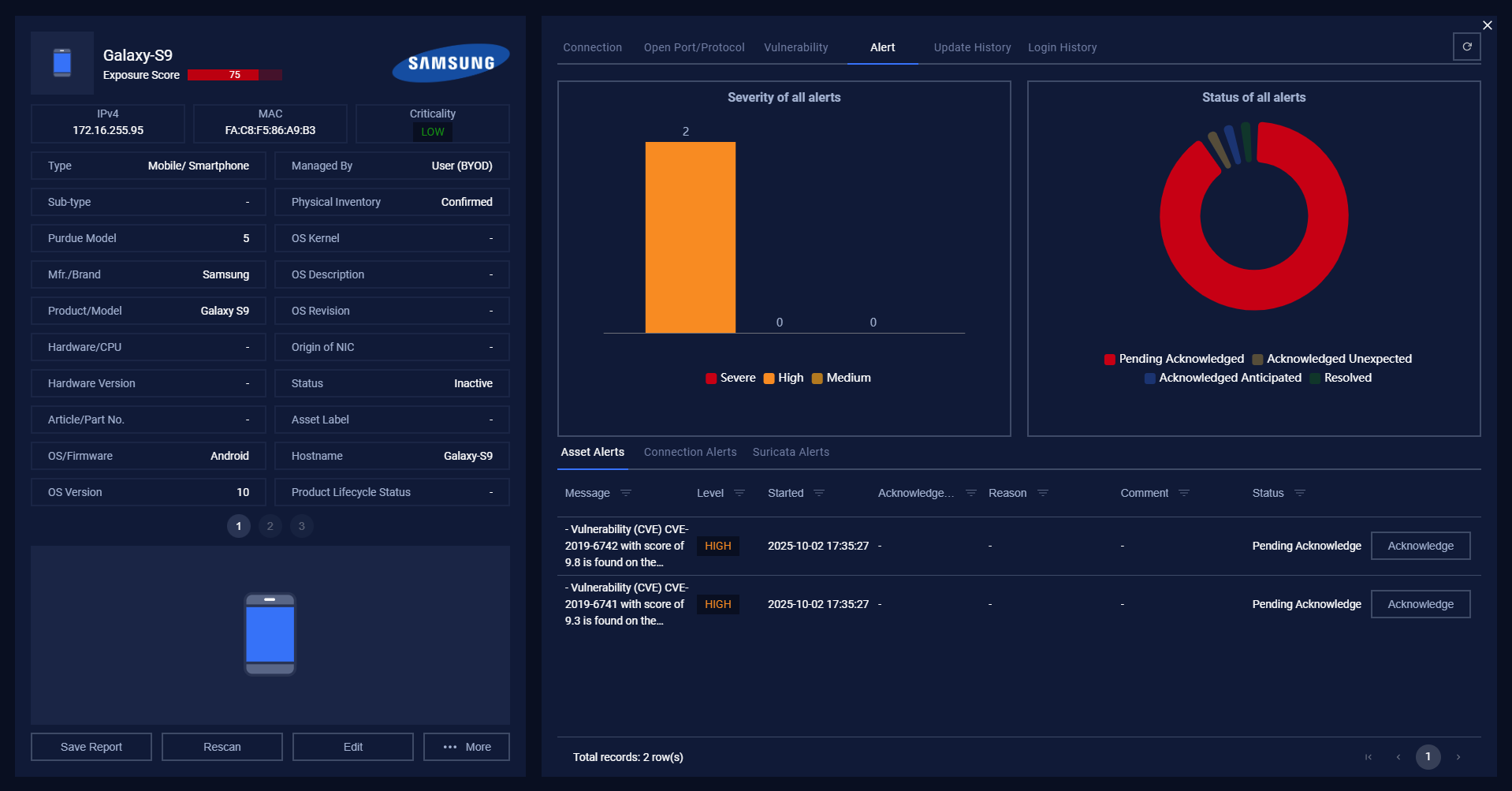 - Suricata Alerts: This page shows all alerts related to devices that violate Suricata policies.