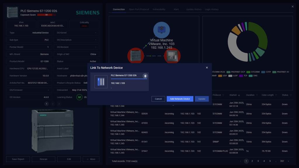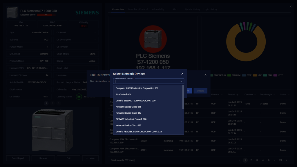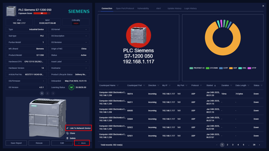 Users can link field assets to one or more controllers by clicking the More button, then selecting Add Network Device, and finally choosing a controller that has been scanned by MetaDefender OT Security.