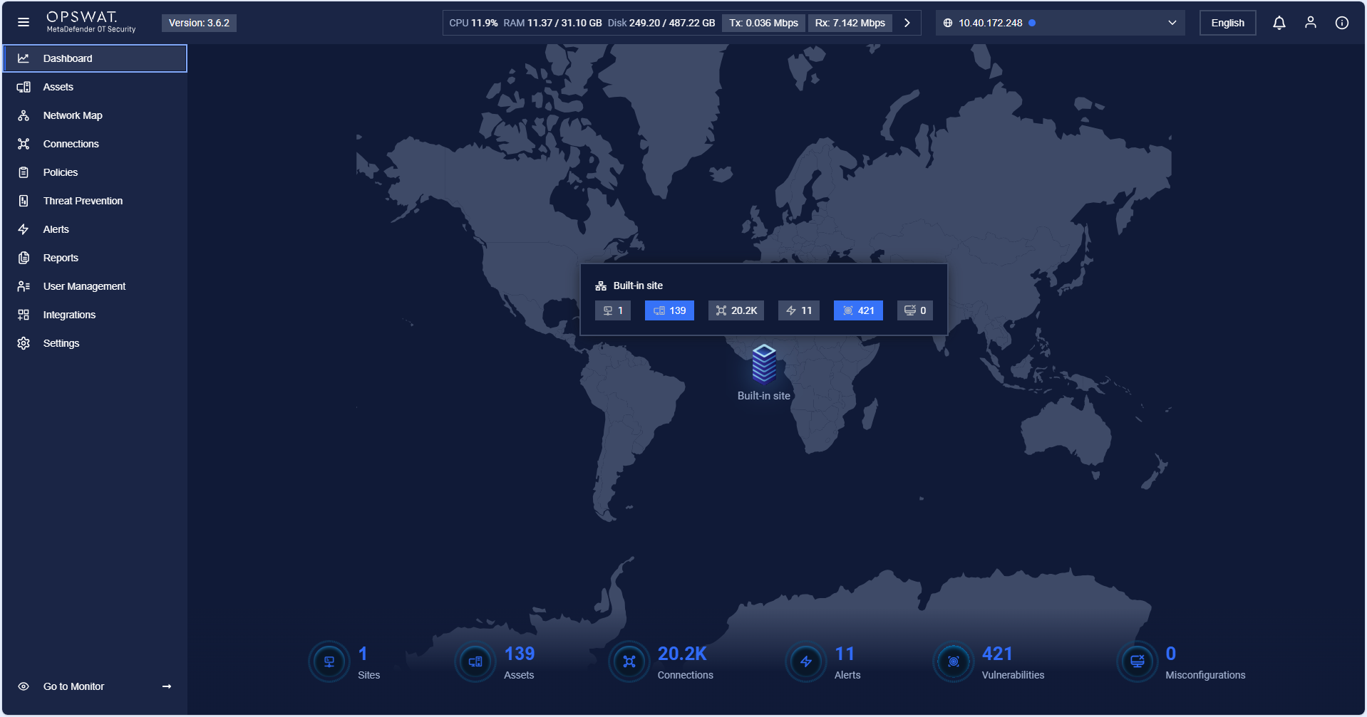 The Enterprise dashboard serves as a comprehensive system overview, presenting information from all sites to help users easily understand and monitor devices. It displays the Alert Status, Asset Status, and Active Connection Status... of all sites, along with graphs for each site.