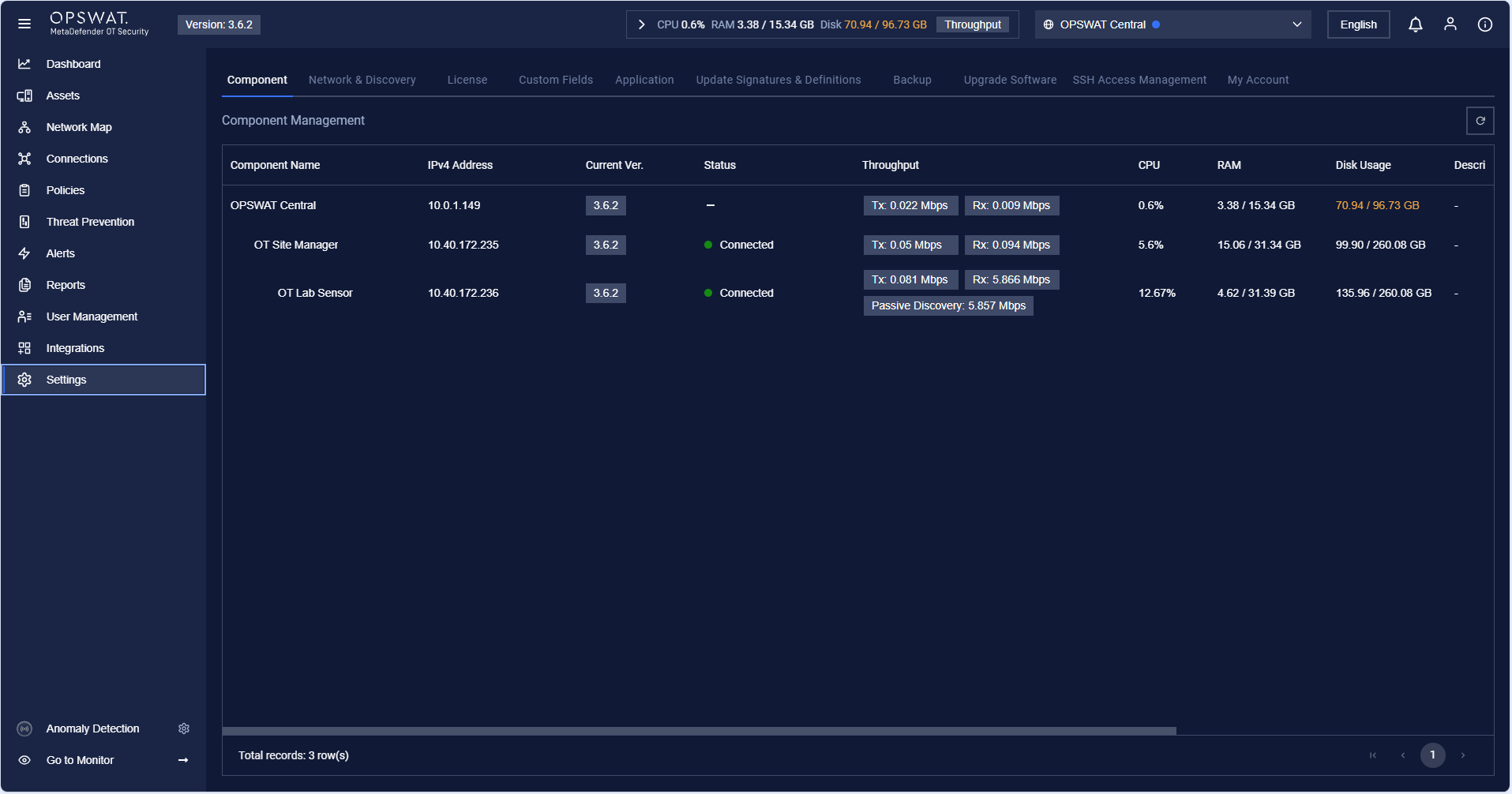 The Enterprise Settings can be accessed by clicking on the Settings menu. On this page, the users can see all the added components here (Site Manager, Network Sensor).
