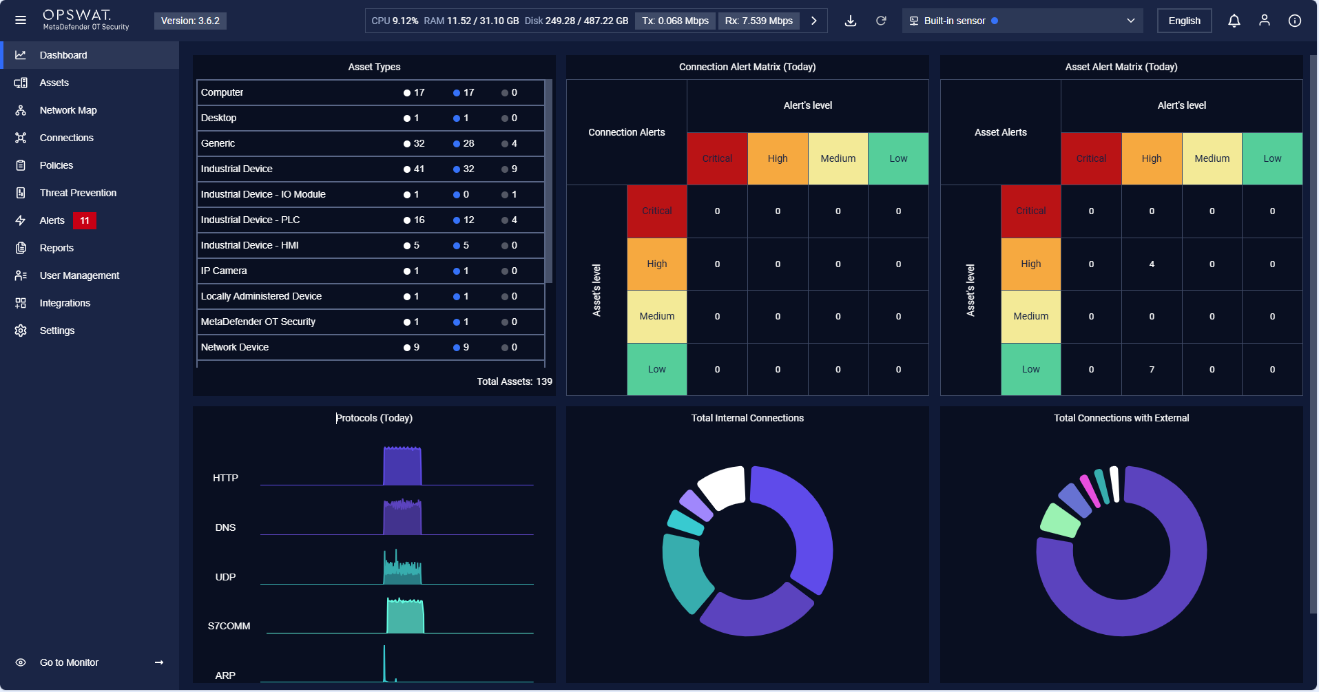 This dashboard provides a quick, high‑level overview of the system so that users can easily understand and monitor assets, connections, and alerts.