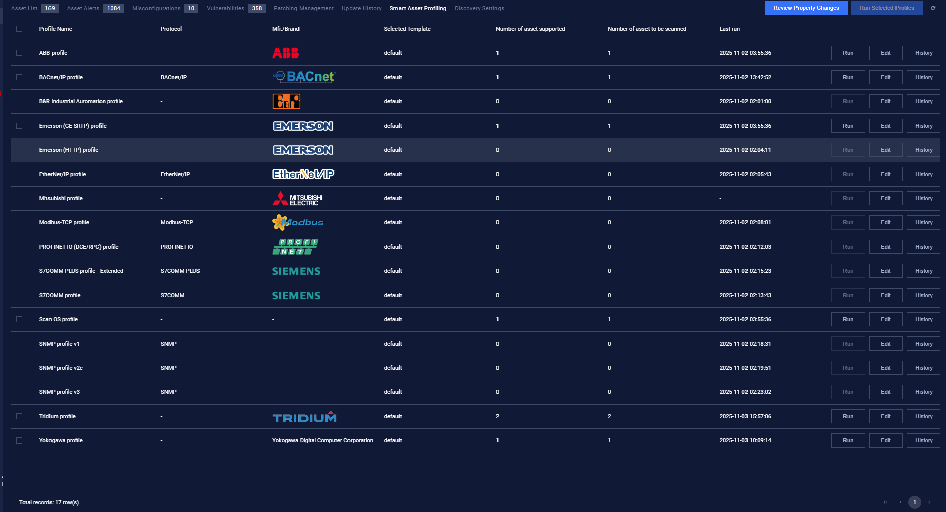 - Information of profile: Profile name, Information icon, Protocol, Number of devices supported, Number of devices supported, Number of devices to be scanned, Created date, Last run.