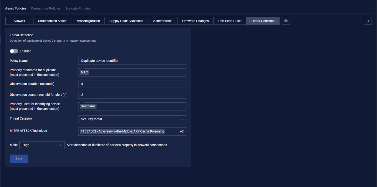 The unauthorized asset page lists asset policies that are detection of duplication of a device’s identifiable property via network connections (e.g., MAC, IP, hostname) in network connections to identify spoofed or cloned devices, and network attacks.