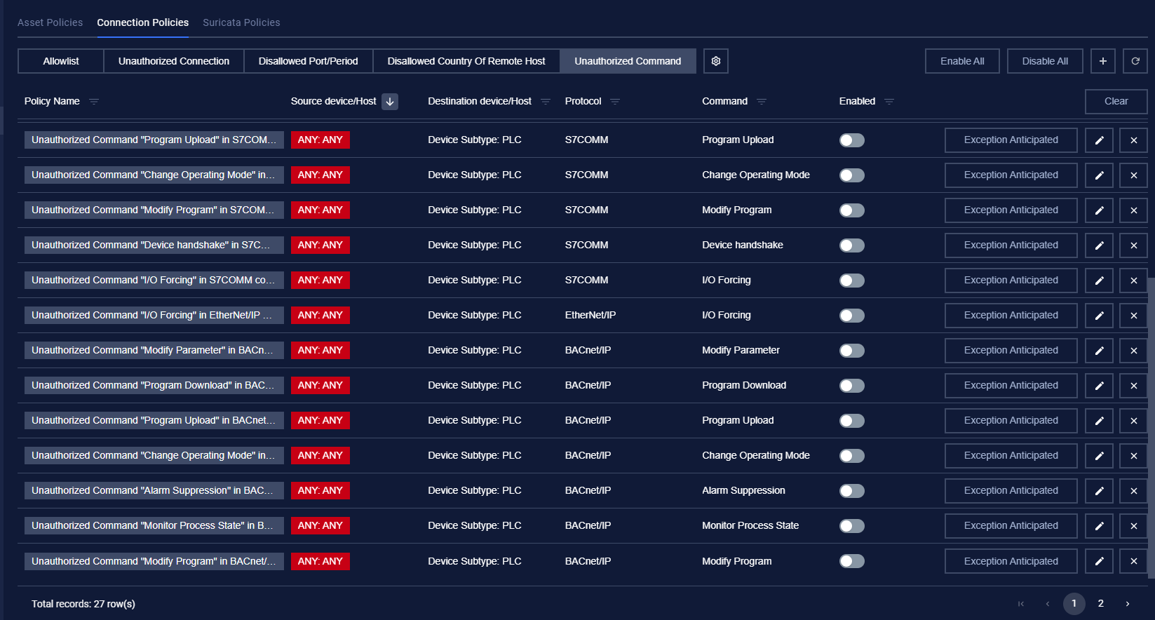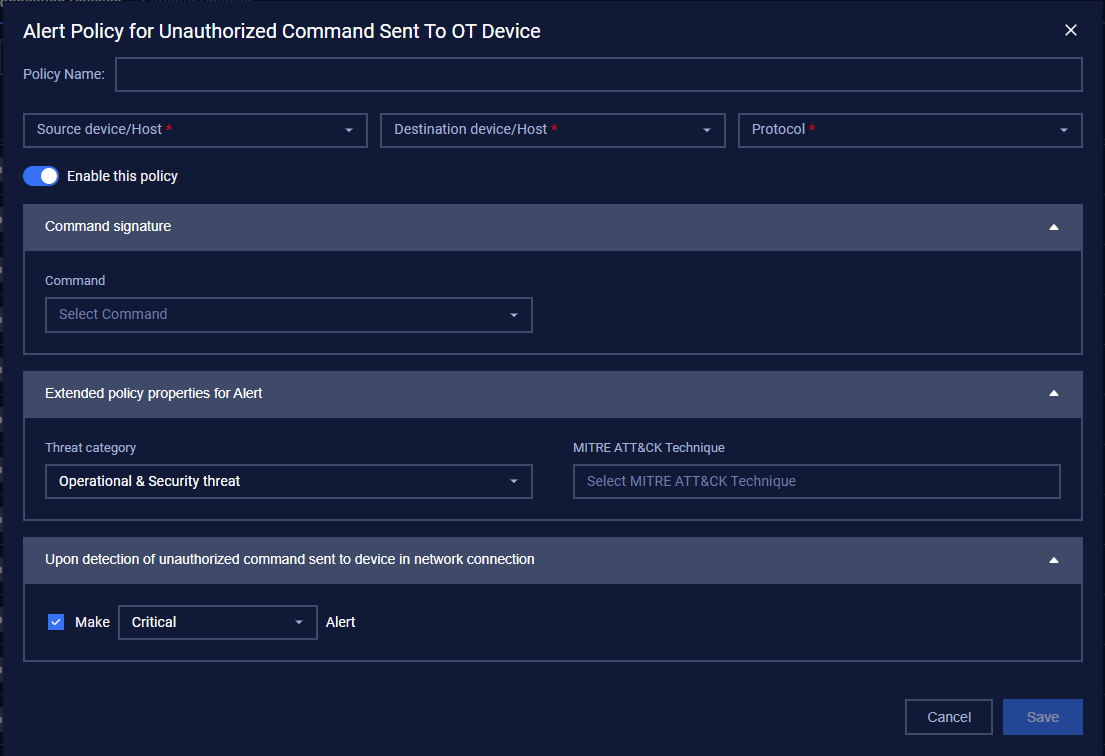 Any asset pair that is listed in the unauthorized command policies will make MetaDefender OT Security trigger an alert when they have unwanted communication in the system.