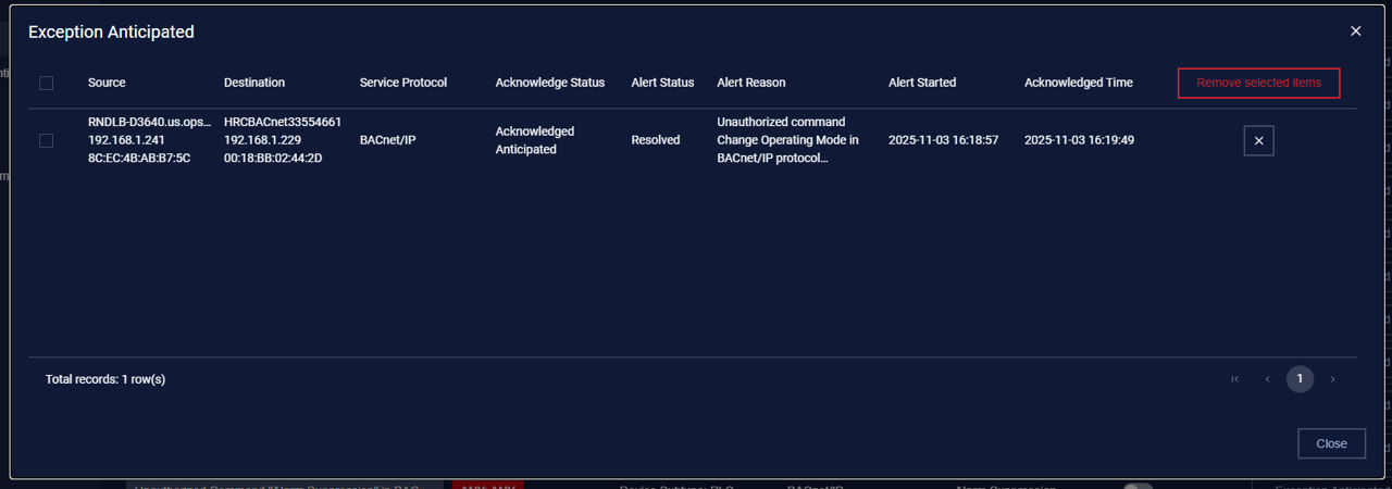 When the user acknowledge anticipated the alert, the item will display in Exception Anticipated. If the user deletes this item, MD OT Security will detect and trigger an alert related to this blocklist policy again.