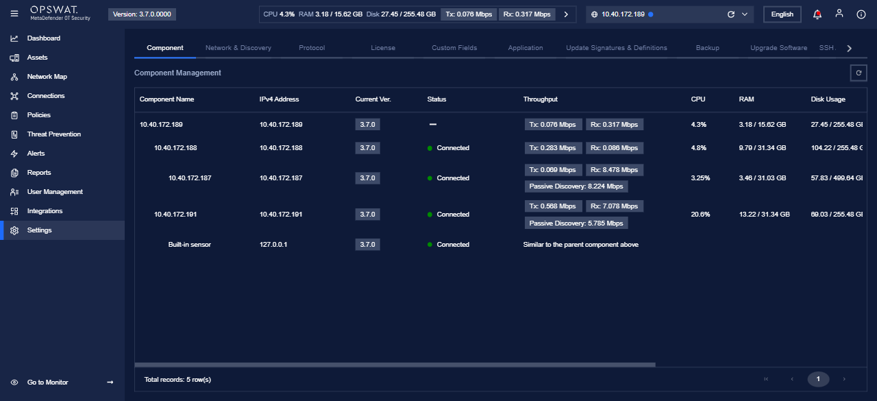 This page describes Settings > Component on the Enterprise node in MetaDefender OT Security. It lists every managed component (Enterprise, Sites, Sensors, built-in sensor) with health and capacity metrics.