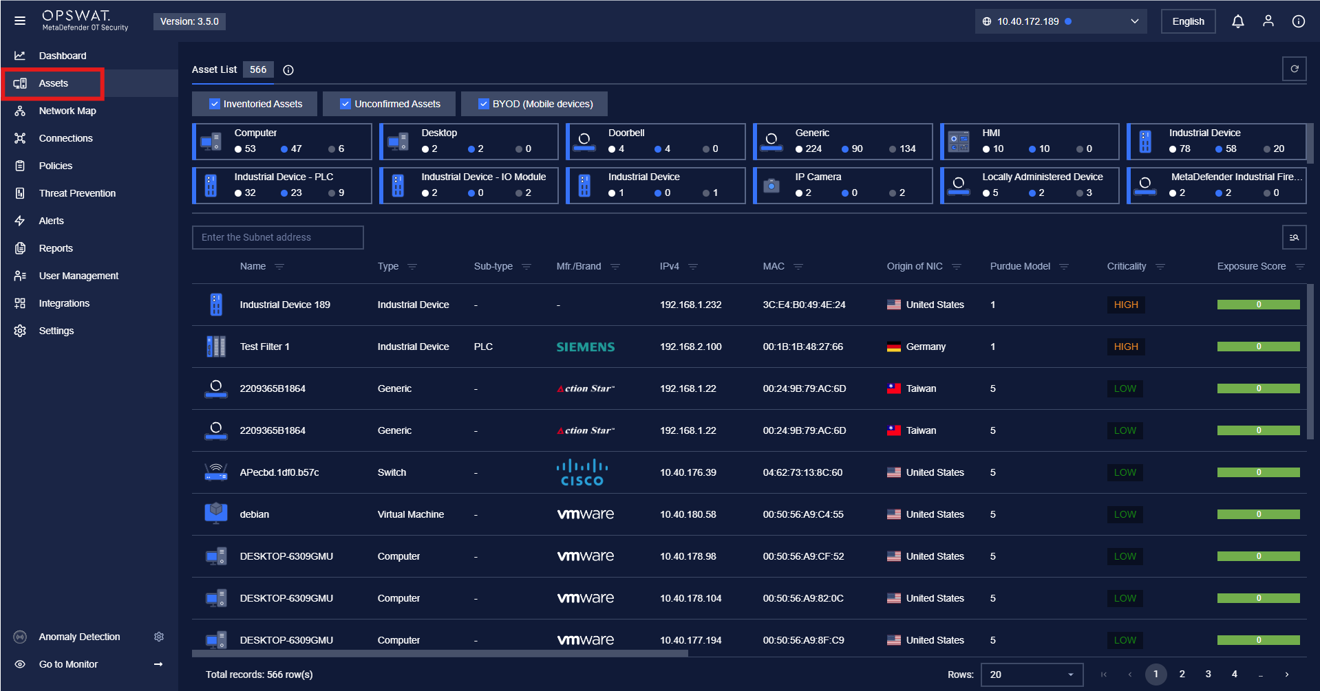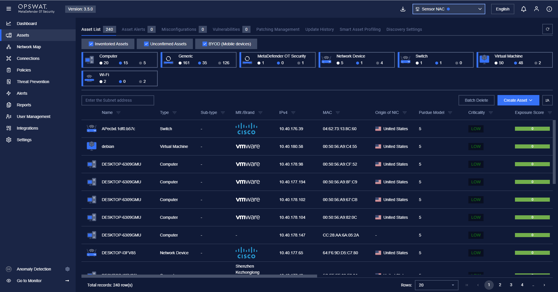 Note: To view all asset information, users need to select a sensor from the list in the top-right corner, then navigate to the Assets page.
