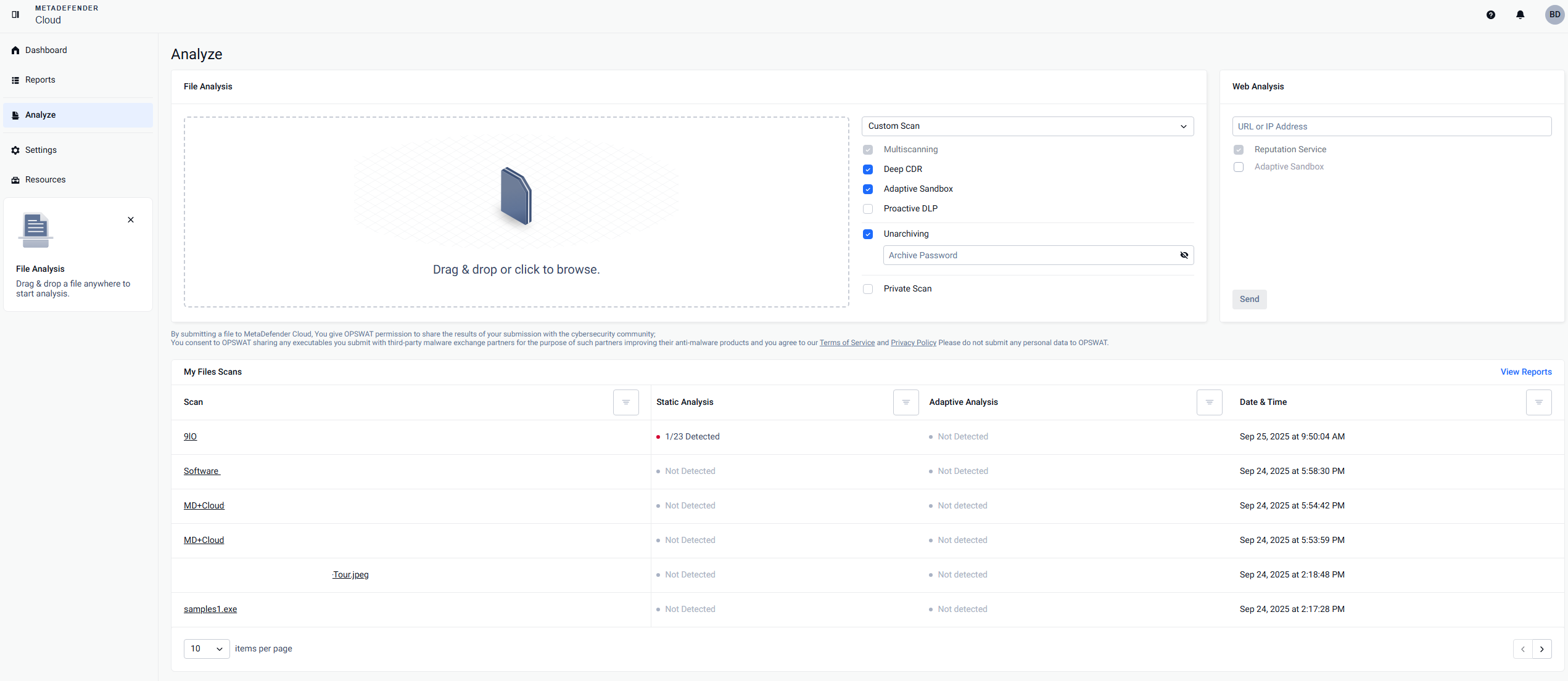 Private scan: available only for paid users, with this option enabled all files scanned in private mode are not stored or shared, although scan results will remain available in the MetaDefender Cloud database.