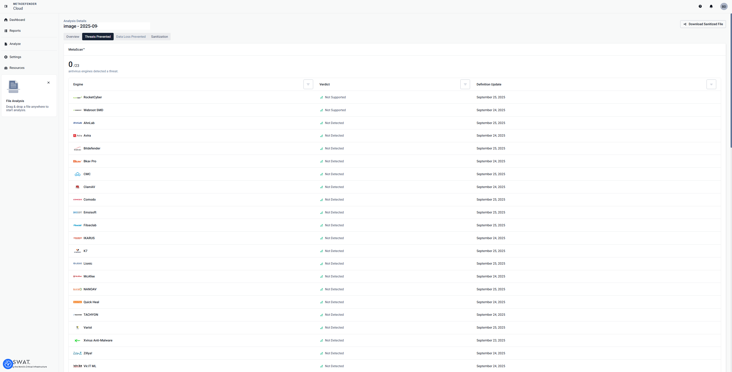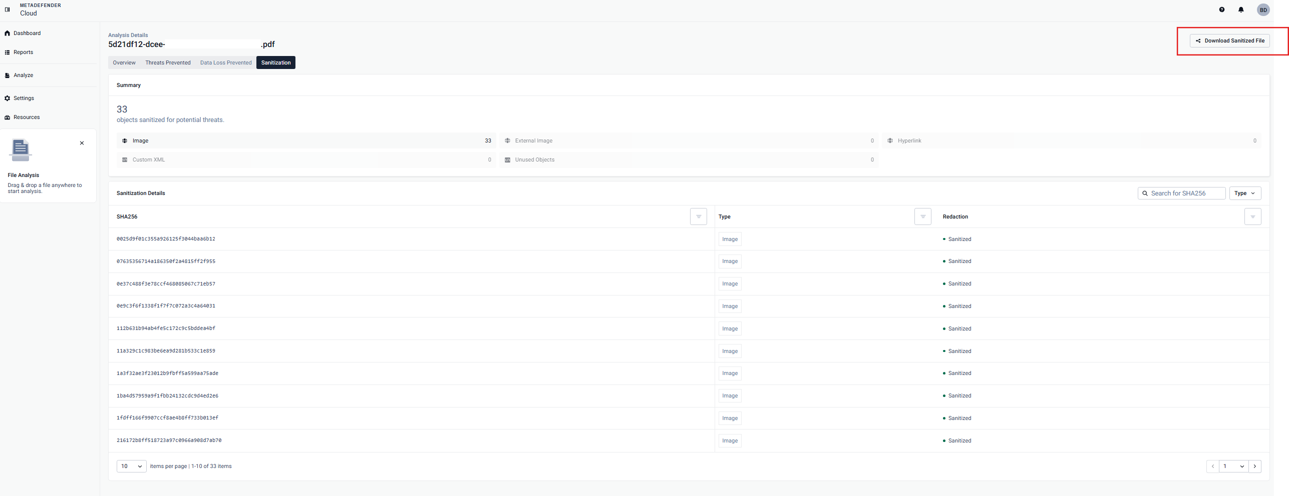 • the possibility to download the sanitized version of the scanned file (if the file can be sanitized)