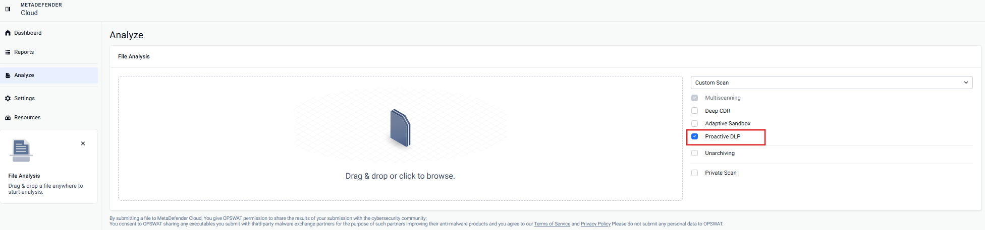 1. To activate this feature, the initial step is to visit metadefender.opswat.com. Once there, by clicking Analyze on the left hand panel, you can easily choose and activate the Proactive DLP feature as depicted below.