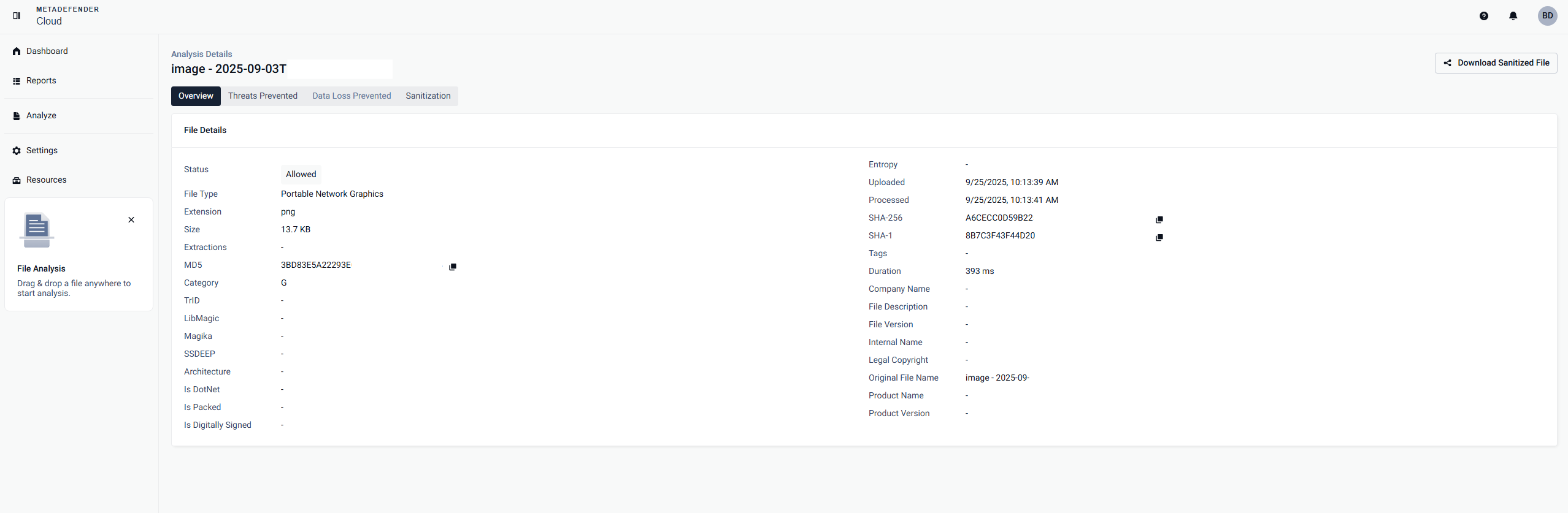 On MetaDefender Cloud, scans and Deep CDR requests are performed asynchronously, and each scan request is tracked by a data ID. On this tab we display the multiscanning report of the sanitized file in order to demonstrate the effectiveness of the sanitization services as well as a link to download the sanitized file.