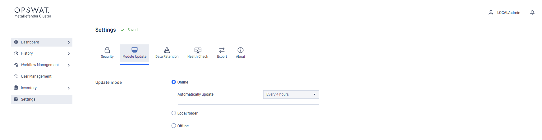 In this mode, MD Cluster Control Center will autonomously download the latest module packages from OPSWAT online update infrastructure, repeating this process every four hours by default.
