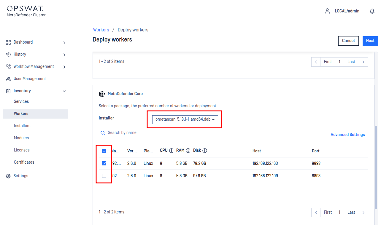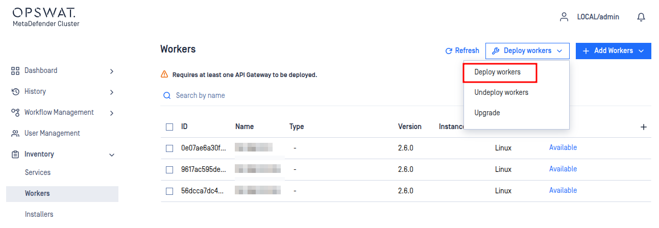 When a new version of MD Cluster API Gateway, MD Cluster Callback Service or MetaDefender Core is available. And all three installers have been uploaded to the Installers section. The system administrator can perform an upgrade for the three products by selecting the Deploy Workers menu and then Upgrade.