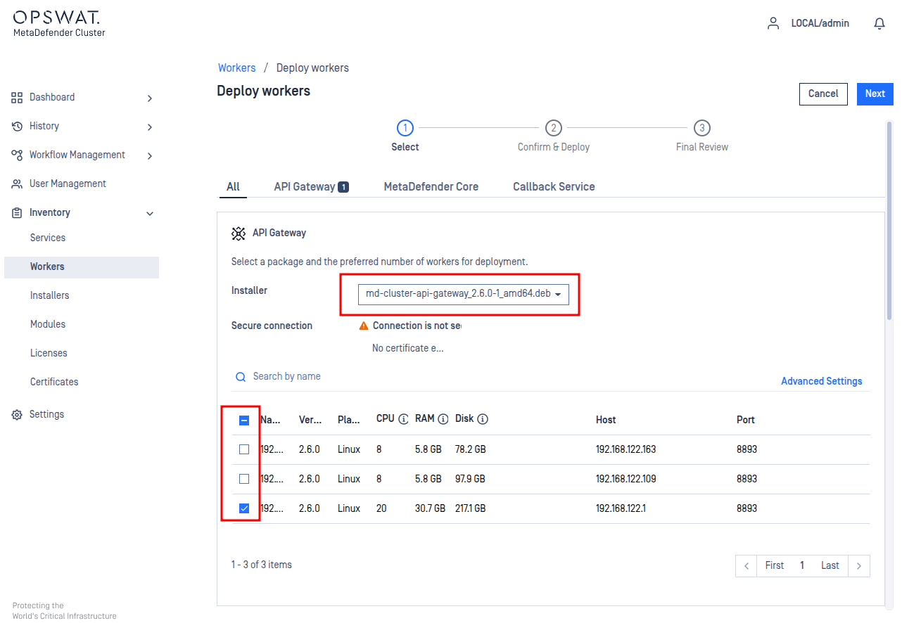 Once MD Cluster Workers have been added and their status are shown as Available. The system administrator can now deploy MetaDefender Core, MD Cluster API Gateway and MD Cluster Callback Service separately or all at the same time.