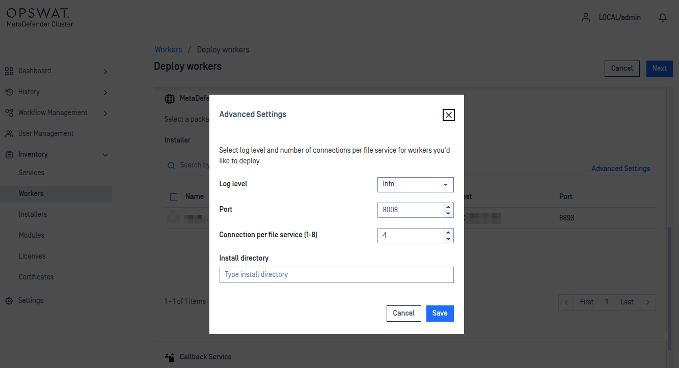 The system administrator can also modify the Log level, Port, custom Install directory, and Connection per file service of MetaDefender Core that will be deployed by selecting Advanced Settings.