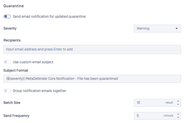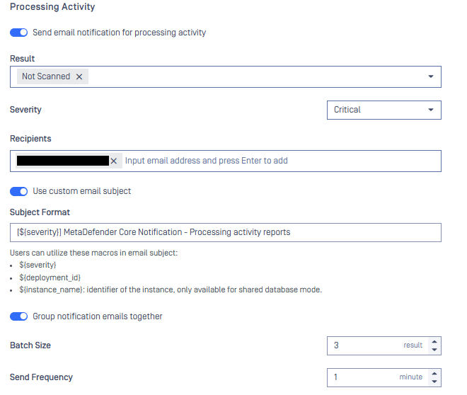 - Batch Size Defines the maximum number of requests included in a single notification email. For example, if the batch size is set to 3, MetaDefender Core will send one email containing the results of up to three requests with the status “Not Scanned.”