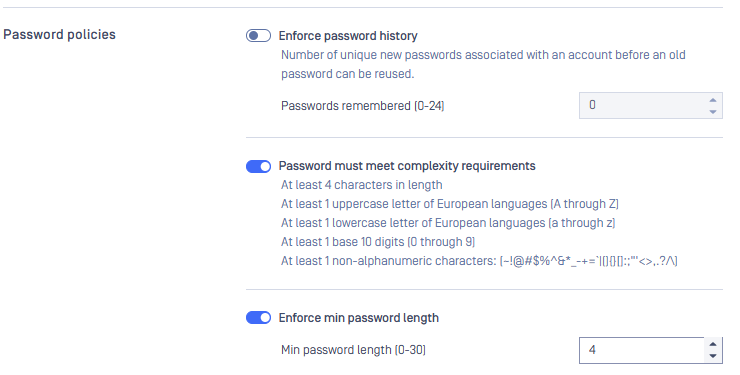 Define a minimum password complexity to protect local MetaDefender Core accounts from guessing and brute-force attacks. Use the following baseline policy as a secure default and tighten it further if your organization has stricter compliance requirements.