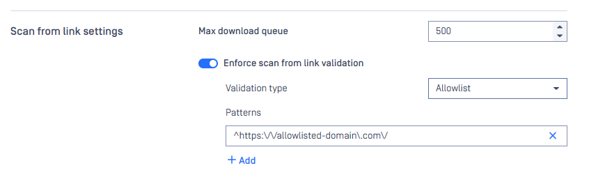 When enforcing scan-from-link validation, prefer an allowlist-based approach. Only permit downloads from explicitly trusted domains or URLs and block everything else by default. This reduces the risk of users downloading files from malicious or typo squatted domains that are not yet known or listed as blocked.
