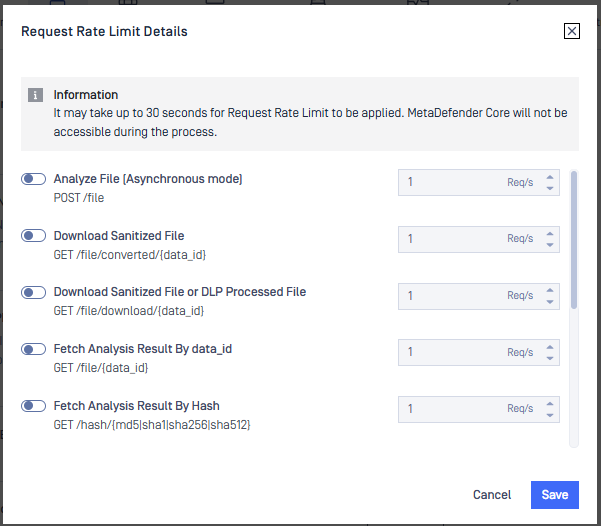 Configure request rate limits for result‑fetching APIs (for example, GET /file/{data_id} and GET /file/{batch_id}) to prevent excessive polling from draining MetaDefender Core resources and degrading scan performance. Without rate limiting, high‑frequency GET requests can starve scanning and processing. From MetaDefender Core 5.13.0 onward, you can set per‑API limits and use webhooks (callbackurl) to avoid constant polling.