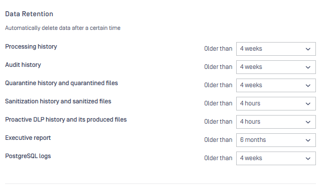 Define how long different data types are kept in MetaDefender Core before automatic cleanup.