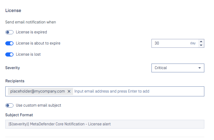 Configure alert emails for key system events so administrators are notified before issues impact service. Use the recommended thresholds and frequencies below (license, disk space, engine updates, certificates) to balance timely warnings with minimal noise.