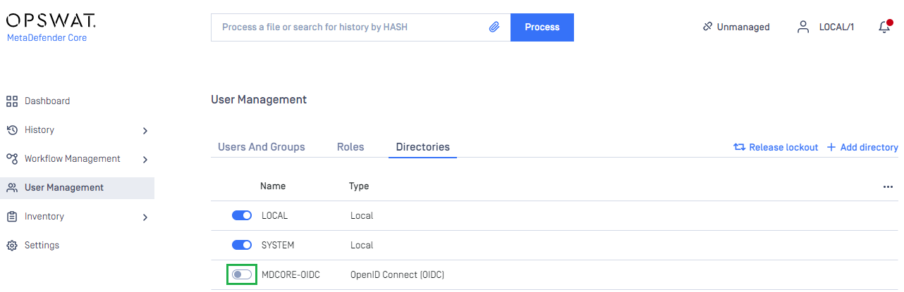 User Managementpage, toggle the new directory, MDCORE-OIDC in this example. A dialog box is shown to confirm the action. OnceEnableis hit, all sessions are expired immediately