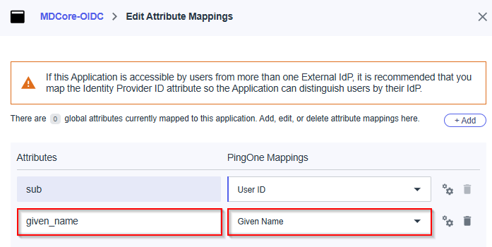 In this step, we make a mapping from the key name used by MDCore and the name exported by PingOne. For example, we set given_name mapped to Given Name exported by PingOne. Later on, given_name is used by MDCore to identify the login user
