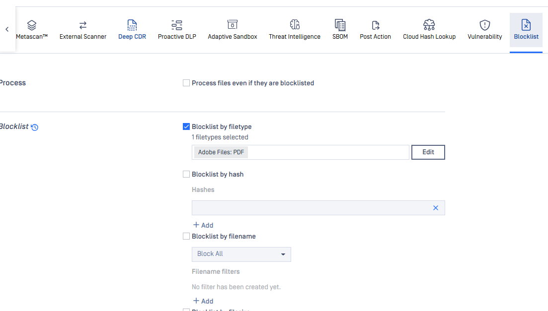 During scan, it is possible to create blocklists where files depending on their file type, checksum (hash), filename, extension, file size or MIME-TYPE. All of these can be stored in the fields on the Blocklist tab. Administrators can select tactic "Block All" or "Block All Except". Also it is available to blocklist all the files coming from the same group, such as Executable Files, Media Files and others.