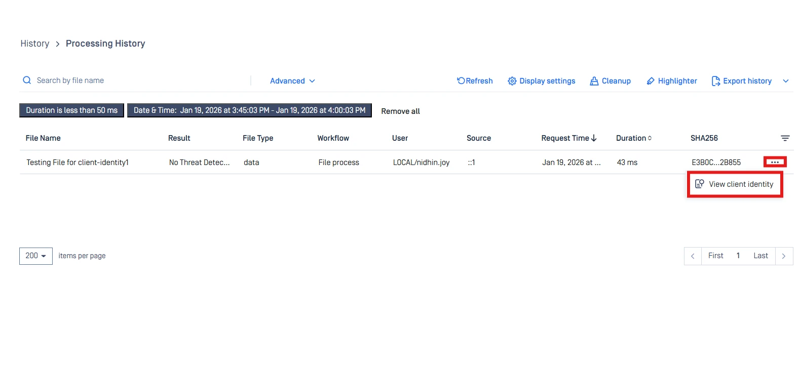 4. Open Processing History in the MD Core UI and select View Client Identity.