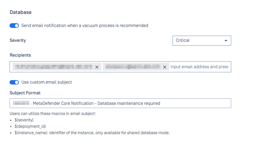 Regular database maintenance is essential to ensuring consistent system performance and reliability. The “Database Maintenance Required” notification provides an early warning that helps prevent potential slowdowns caused by data fragmentation. By running the ometascan-vacuum-db tool promptly after receiving the notification, administrators can optimize storage usage, maintain faster query speeds, and enhance the overall efficiency of MetaDefender Core.