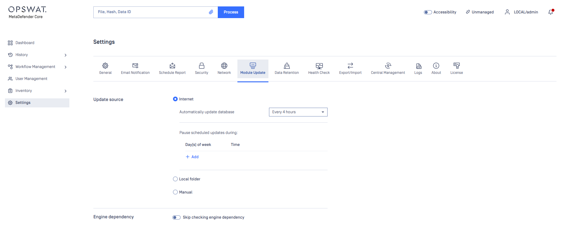 https://update.dl.opswat.com) to automatically initialize and update its modules. - Local Folder Update Module packages can be placed in a designated local directory, from which MetaDefender Core automatically detects and applies updates.