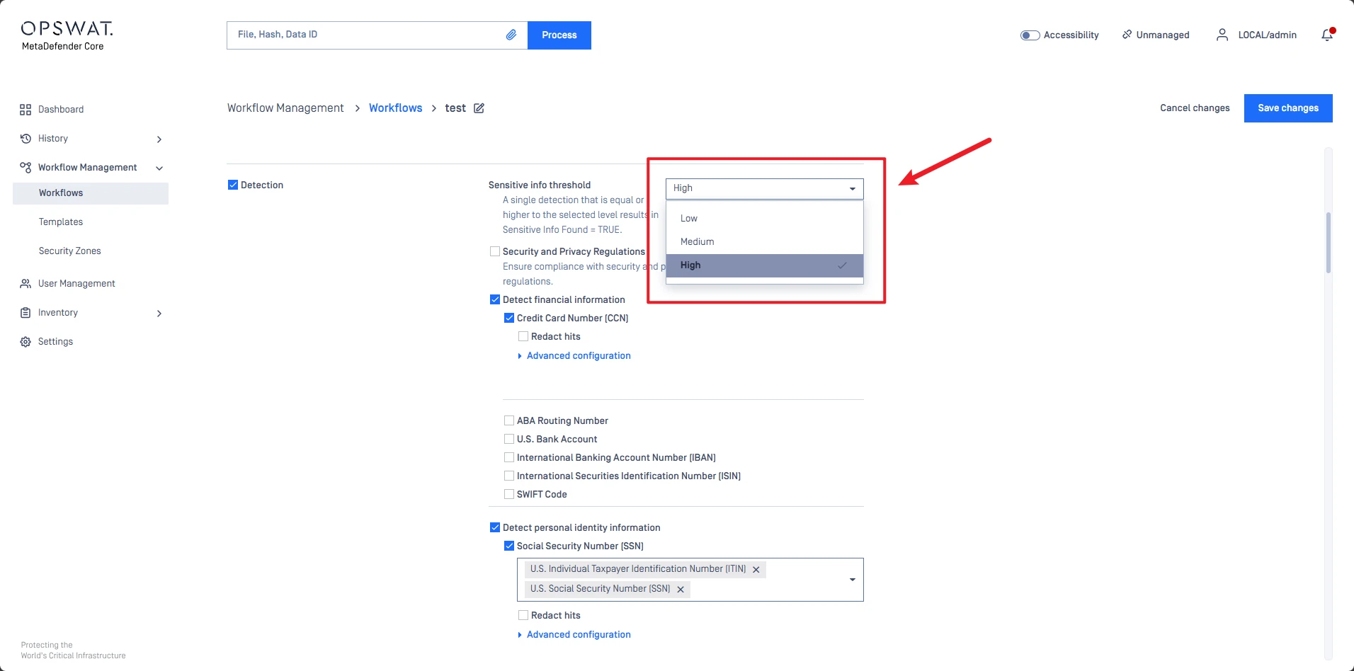 A file is only flagged as "Sensitive Data Found" if at least one detection meets or exceeds the selected threshold level.