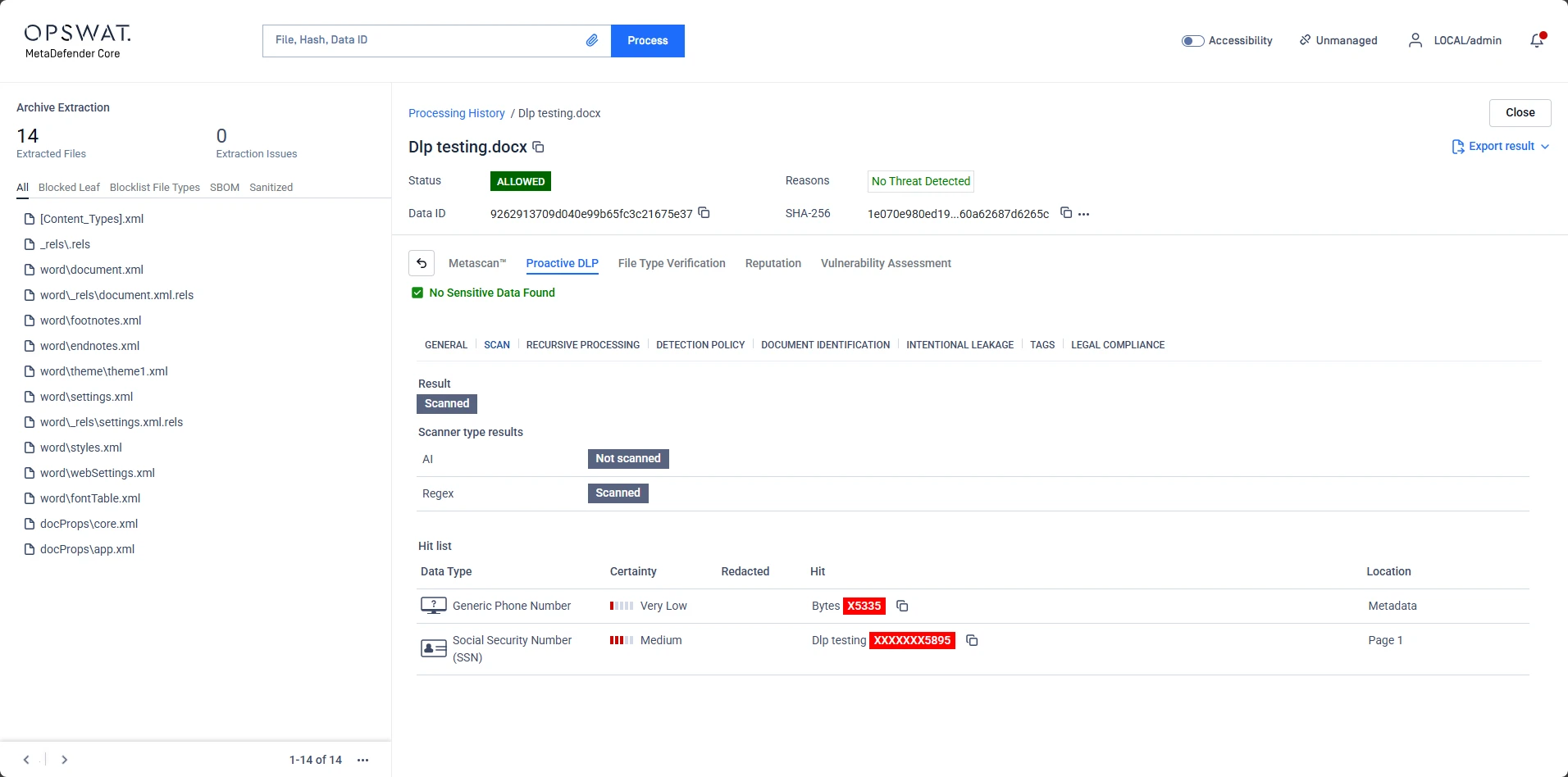 In MetaDefender Core, a file may contain sensitive information (such as SSNs or phone numbers) but still receive an "ALLOWED" status. This typically occurs due to the Sensitive Info Threshold settings.