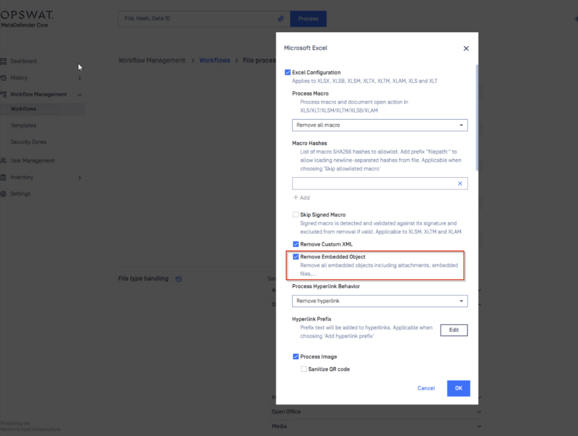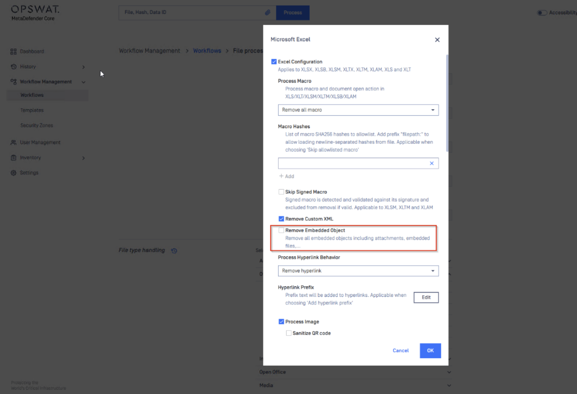 - Always ensure that disabling embedded object removal aligns with your organization’s security policy, as it may increase the risk of allowing hidden or embedded malicious content.