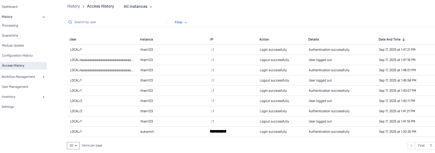 The Access history page shows all the information about the user's access activities:
