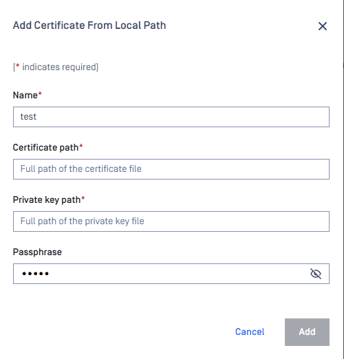 - Name: Certificate name - Certificate Path: Absolute path to the certificate file - Private Key Path: Absolute path to the private key file - Passphrase: Enter the passphrase for the private key (if required)
