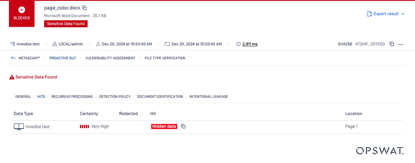 Malicious insiders often employ subtle techniques to evade DLP controls and conceal sensitive information within files or documents. Two common evasion methods include invisible text and small font manipulation, both of which are now detectable through OPSWAT Proactive DLP’s advanced content inspection.