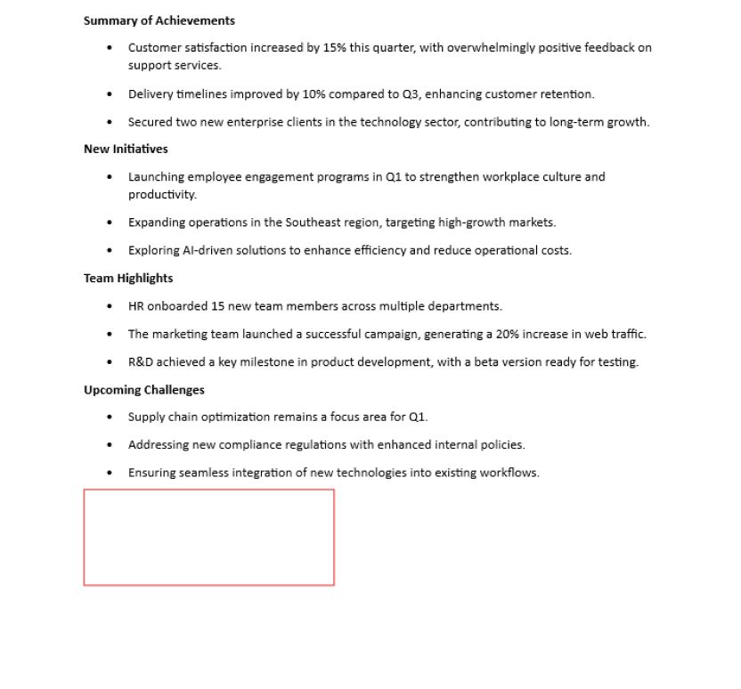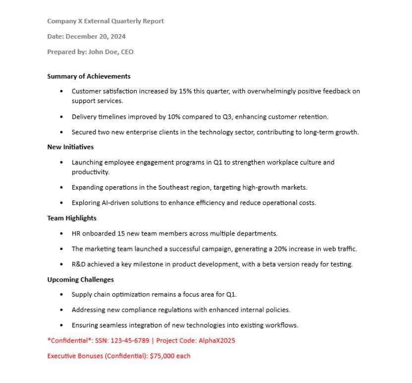 - Invisible Text Detection: Detects hidden or white-colored text embedded within documents or images that is not visible to human reviewers but can still be processed by digital systems. This technique is often used to conceal confidential data, trigger automated workflows, or bypass keyword-based inspection mechanisms.