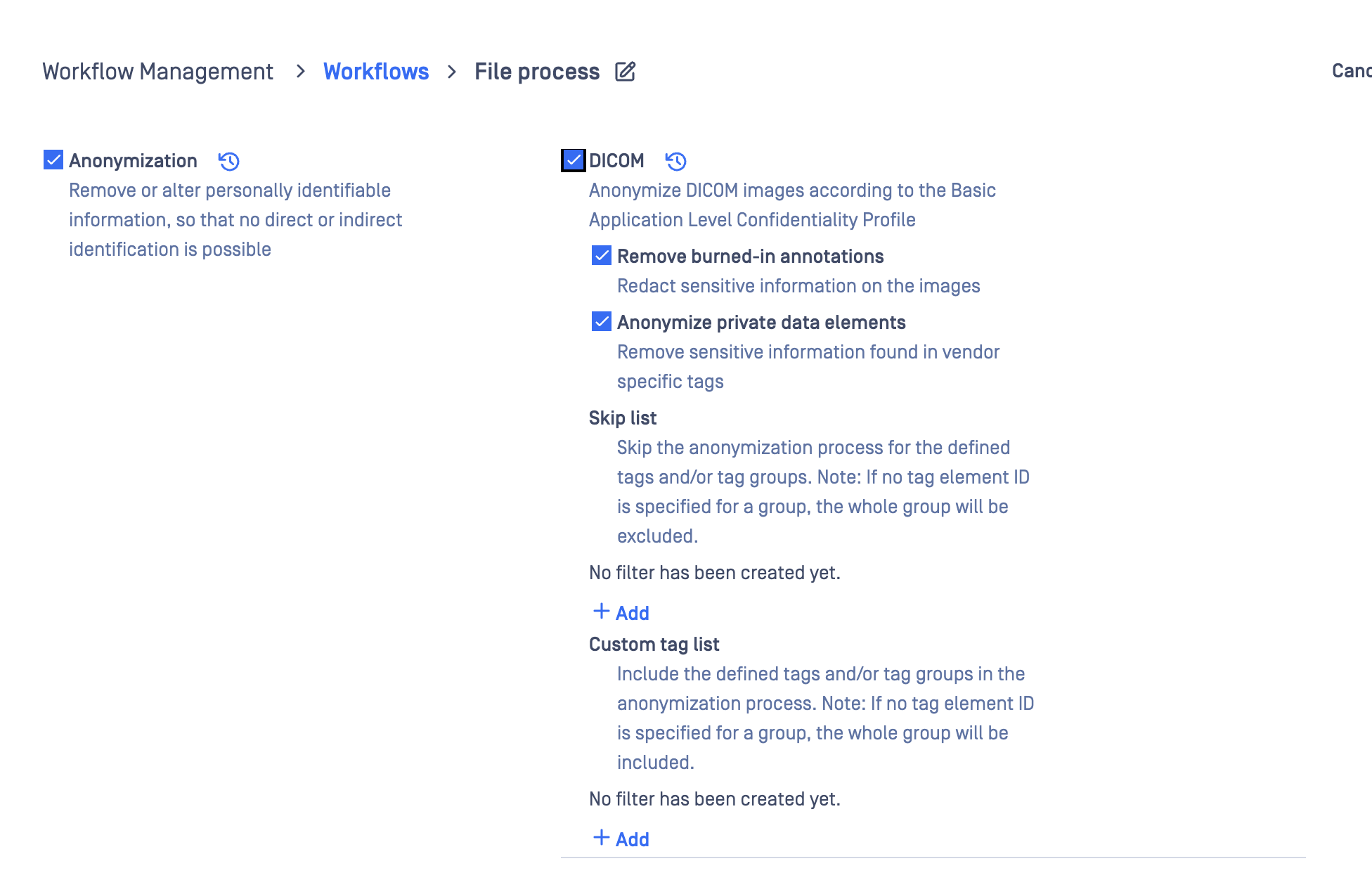 - Skip list: users can define specific tags or tag groups that should be excluded from the anonymization process.
