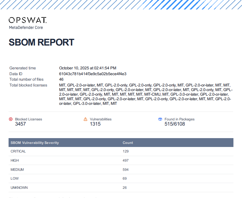 The SBOM PDF report has been enhanced to display vulnerability severity statistics, highlight blocked licenses, and list problematic files and libraries at the top. These improvements help users quickly identify and address the security and compliance issues in their software bill of materials.