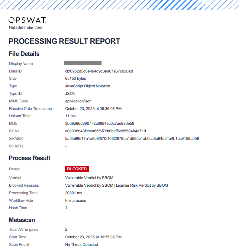 Delivering a major upgrade to MetaDefender Core’s PDF reporting. The processing result PDF report has been completely restructured for clarity and consistency, featuring a new and improved layout. Threat Indicators and IOCs from Adaptive Sandbox analysis are now included directly in the report for deeper visibility into potential threats.